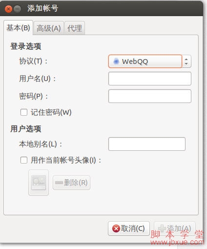 协议(T)中选择 WebQQ,用户名和密码为你的qq的用户名和密码。 然后点击添加,操作完成。 #linux
