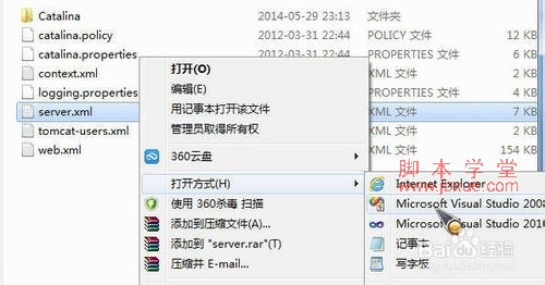 3、在目录“Tomcat7.0conf”下找到“server.xml”文件,用VS或者其他能解译xml文件的工具打开: