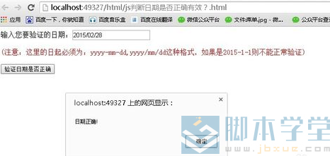如果我们我们输入:2015-02-28或者2015-02-28 则提示:“日期正确”。