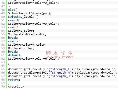 javascript部分,比较主要,在此判断密码强度,这里一共用了四个自定义函数分别实现密码字符串的类型判断、模式统计、返回密码强度级别、根据密码框失去焦点来显示不同的颜色,以警示密码强度值,具体代码: