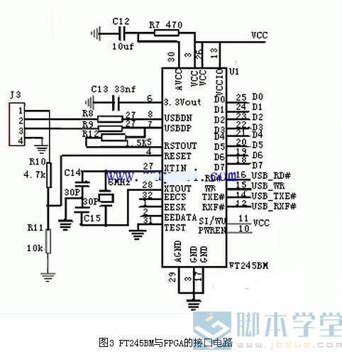 图3是FT245BM的USB与FPGA的接口电路,FPGA选用ALTERA EPF1K50TC-144,其中D0~D7是FT245BM与FPGA交换数据的数据总线,USB_RD#、USB_WR、USB_TXE#、USB_RXF#是相关的控制总线。