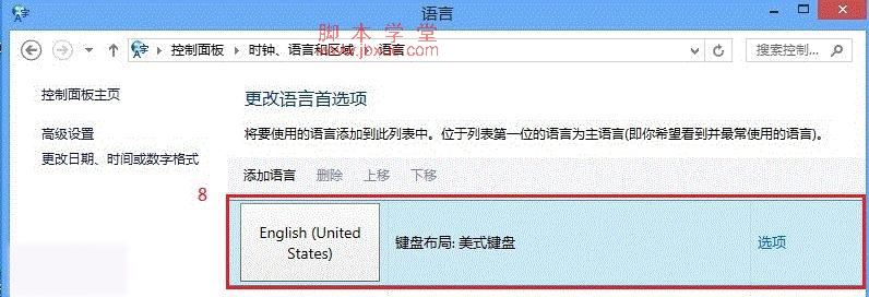 步骤五 此时发现“英语(美国)”语言已添加,但是还是无法直接删除“微软拼音简捷”输入法,“删除”选项是灰色的,此时需要点击“下移”,把我们要删除的输入法调整为不是首选输入法。