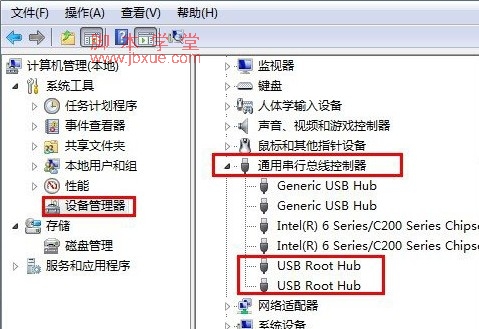 接下来,在计算机管理窗口中找到设备管理器,然后在右边的界面依次找到“通用串行总线控制器”下的两个USB Root Hub选项。